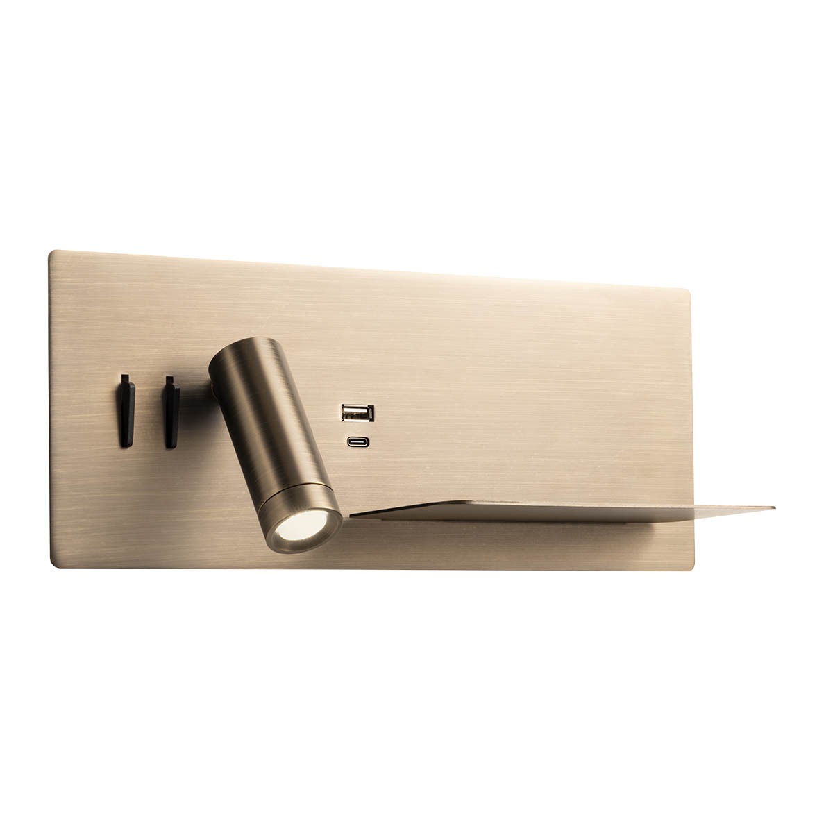 Nástěnné interiérové svítidlo, vybavené LED diodami SMD, kovová konstrukce s držákem na mobil, lakované antickou mosaznou barvou, boční difuzor ze saténového akrylu, vybavené nabíjecím portálem USB a přepínači.