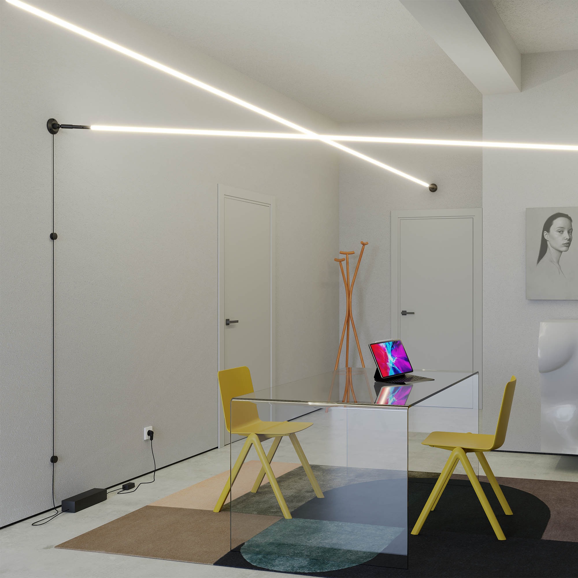 Sada napájecího zdroje a stmívače pro osvětlovací systém FREEDOM 360, příslušenství pro upevnění kabelu (4 metrů) na stěnu a pískově černé lakované hliníkové pouzdro napájecího zdroje, dodávané s napájecím kabelem a černou zástrčkou.