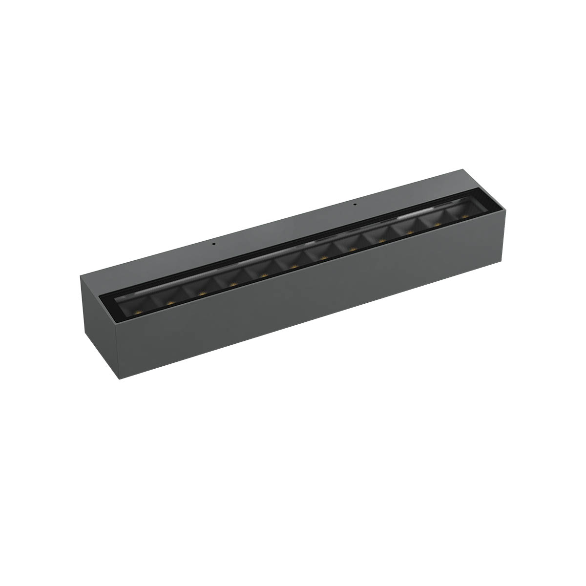 Exteriérové nástěnné svítidlo vybavené SMD LED diodami s nepřímým vyzařováním světla, kryt z hliníkového odlitku, elektrostaticky lakovaný v tmavě šedé barvě, polykarbonátové reflektory, prizmatické difuzory z tvrzeného skla.