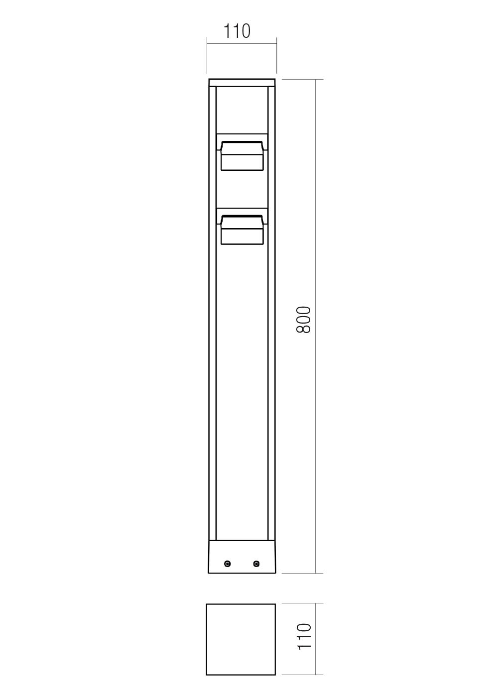 Exteriérové svítidlo, sloupek vybavený dvěma nastavitelnými mini projektory, voděodolný, prachotěsný s COB LED CREE diodami. Tělo z hliníku odlitého pod tlakem s ochranou proti korozi a rzi pomocí kataforézy, elektrostaticky lakované v rezavě hnědé barvě. Optický systém S PMMA FRESNEL čočkou a úhlem rozptylu 35°. Skleněný difuzor s černým sítotiskovým rámečkem. Dodává se s voděodolným konektorem IP68,