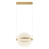Závěsné svítidlo pro interiér vybavené LED diodami SMD, struktura z kovu a hliníku v matném mosazném zlatě, průhledný akrylový difuzor s bílým sítotiskem. Svítilna je stmívatelná TRIAC stmívačem.