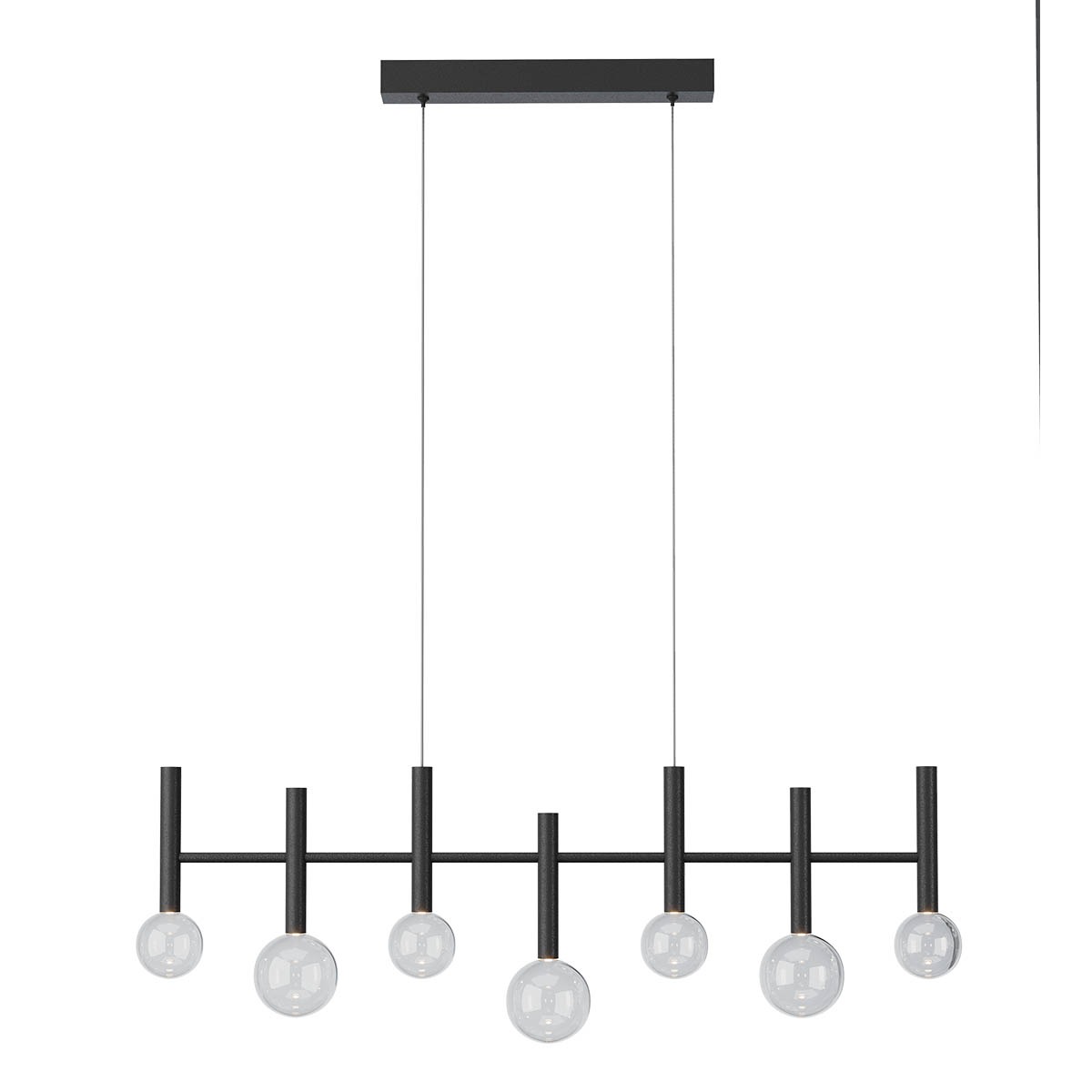 Závěsné interiérové svítidlo s COB LED diodami, stmívatelné TRIAC, kovová a hliníková konstrukce natřená v matné černé barvě, difuzory z průhledného foukaného skla.