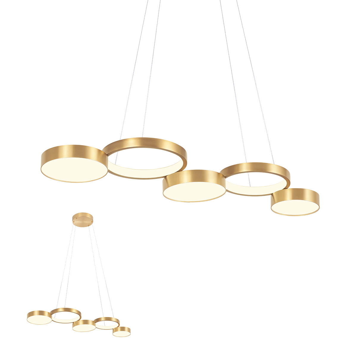 Závěsné interiérové svítidlo se 3 krokovým stmíváním vypínačem, vybavené LED SMD diodami, struktura z hliníku a kovu s bronzovou povrchovou úpravou. Difuzory ze saténového bílého akrylu.