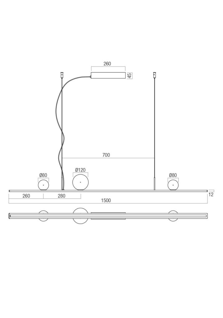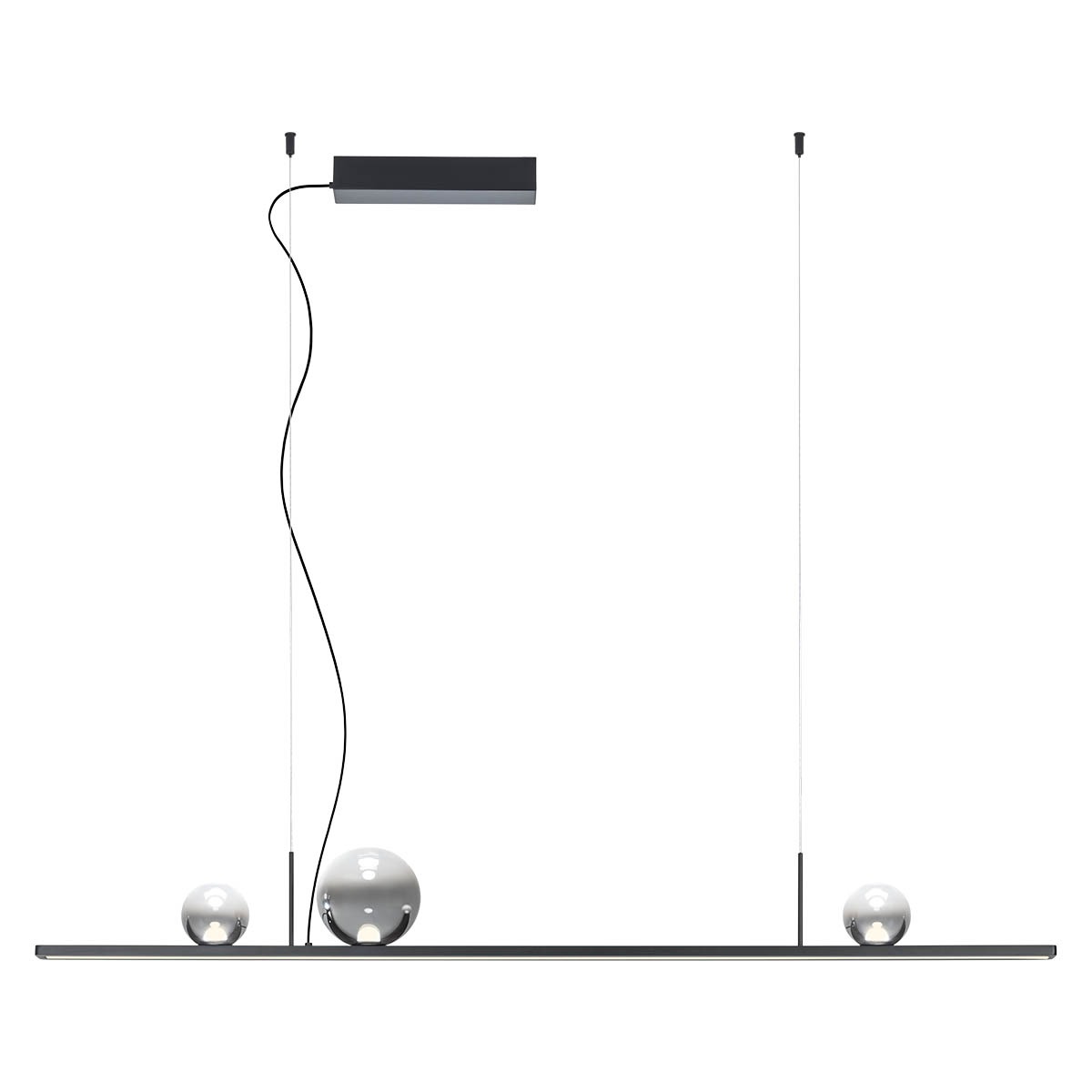 Závěsné interiérové svítidlo s SMD LED diodami, stmívatelné, s přímým/ambientním vyzařováním světla. Konstrukce z extrudovaného hliníku s povrchovou úpravou v pískové černé barvě, opálově bílý polykarbonátový difuzor pro přímé světlo a třemi koulemi z gradientního kouřového foukaného skla pro ambientní světlo.