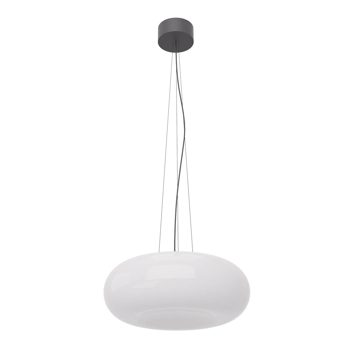 Závěsné interiérové svítidlo, osazené SMD LED, s možností volby teploty barvy světla, stmívatelné, hliníková konstrukce elektrostaticky lakovaná v pískové černé barvě, difuzor z foukaného opálového bílého skla.