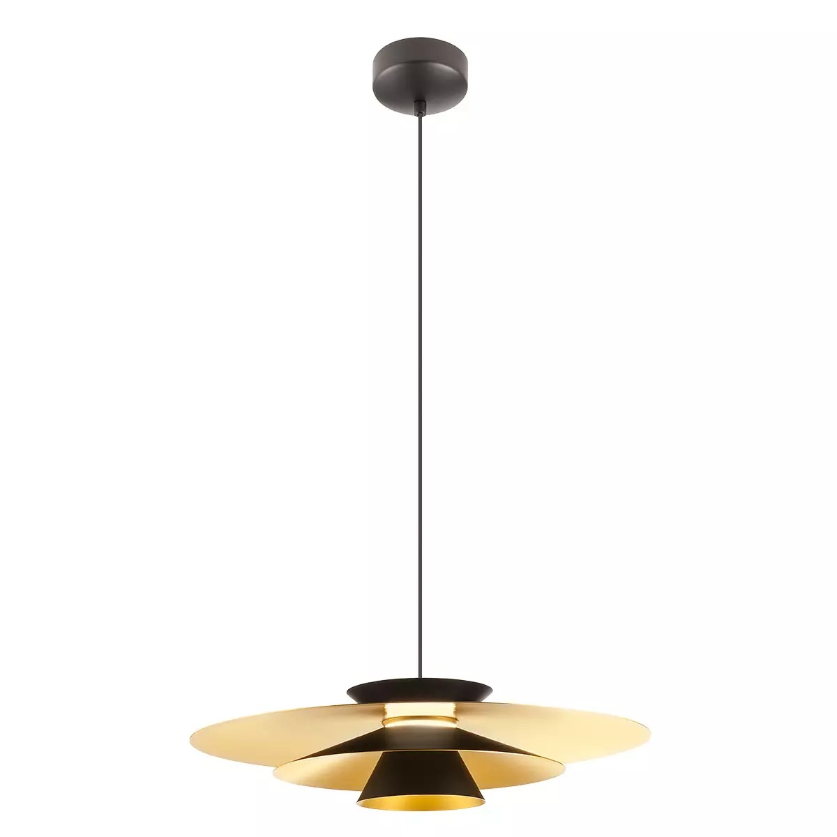 Závěsné interiérové svítidlo vybavené SMD LED, matná černá lakovaná kovová konstrukce, kovové difuzory v barvě laku: matná černá zvenčí a matná zlatá zevnitř. Opálový akrylový difuzor pro LED diody.