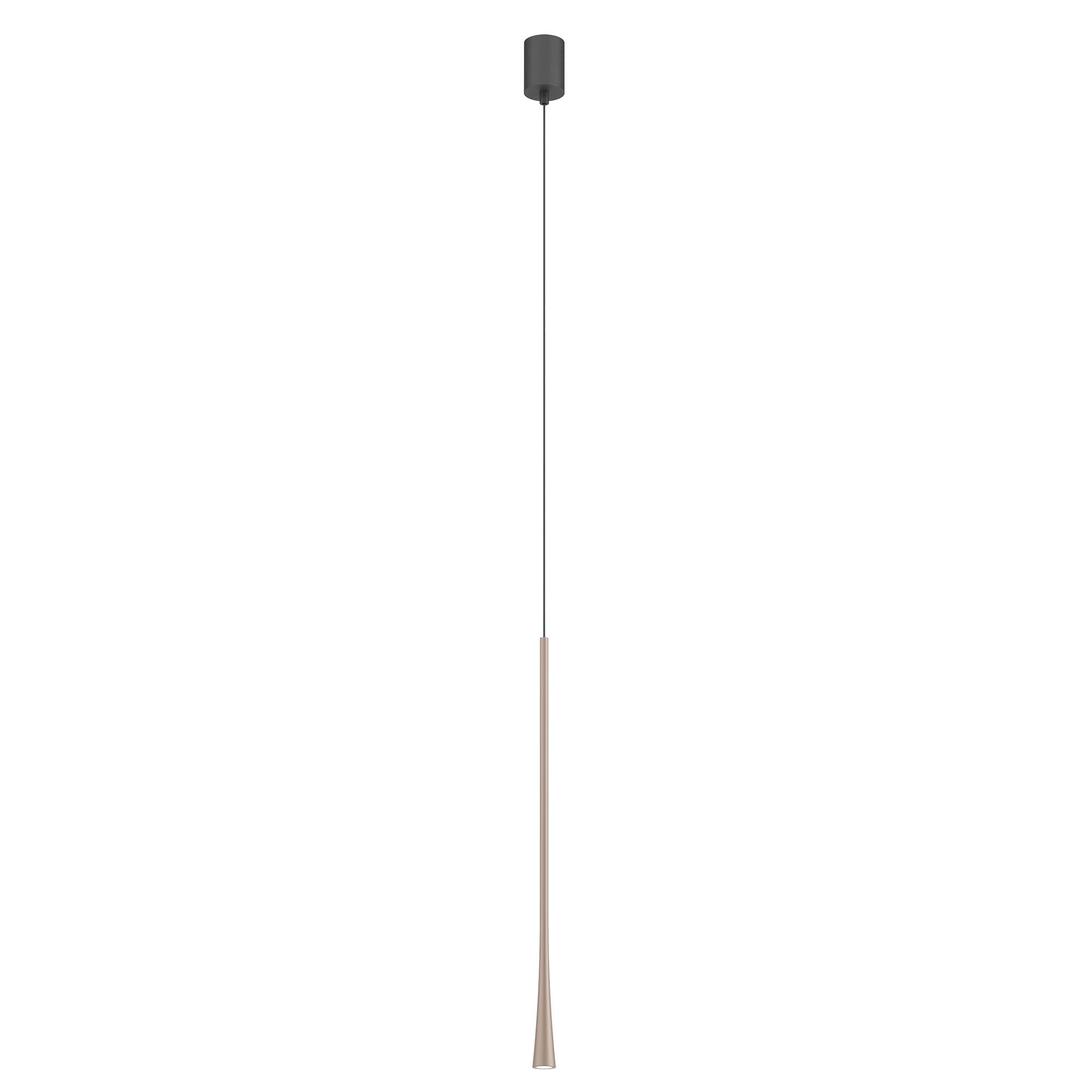 Závěsné interiérové svítidlo vybavené COB LED, pískově černý lakovaný upevňovací kryt, stříbrno kávové lakované extrudované hliníkové tělo, černý kabel, průhledný polykarbonátový difuzor.