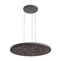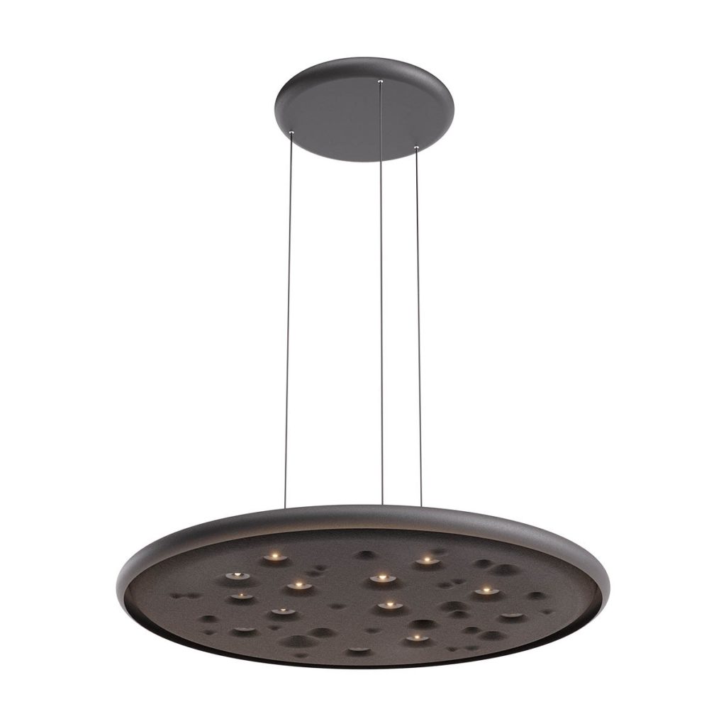 Závěsné svítidlo pro interiér vybaveno SMD LED, stmívatelné pomocí TRIAC. Hliníková konstrukce lakovaná v matné šedé barvě, matný černý lakovaný difuzor vybavený černým plstěným kotoučem pohlcujícím zvuk, průhledné čočky PMMA.